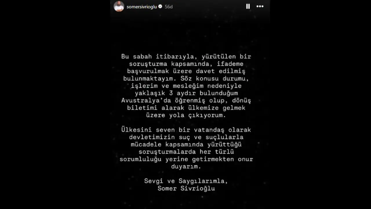 Operasyon sırasında yurt dışında olduğu belirtilen Somer Sivrioğlu, sosyal medya hesabından yaptığı açıklamada soruşturma kapsamında ifadesine başvurulmak üzere davet edildiğini duyurdu. Yaklaşık üç aydır Avustralya’da bulunduğunu belirten Sivrioğlu, durumu bu sabah itibarıyla öğrendiğini ve Türkiye’ye dönmek üzere yola çıktığını açıkladı. Sivrioğlu, açıklamasında devletin suç ve suçlularla mücadele kapsamında yürüttüğü soruşturmalarda her türlü sorumluluğu yerine getireceğini ifade etti.